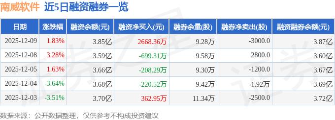 南威软件融资融券信息数据显现,融资方面,当日融资买入1.08亿元,融资归还8100.16万元,融资净买入2668.36万元。融券方面,融券卖出600.0股,融券归还3600.0股,融券余量9.28万股,融券余额134.1万元。融资融券余额3.87亿元。